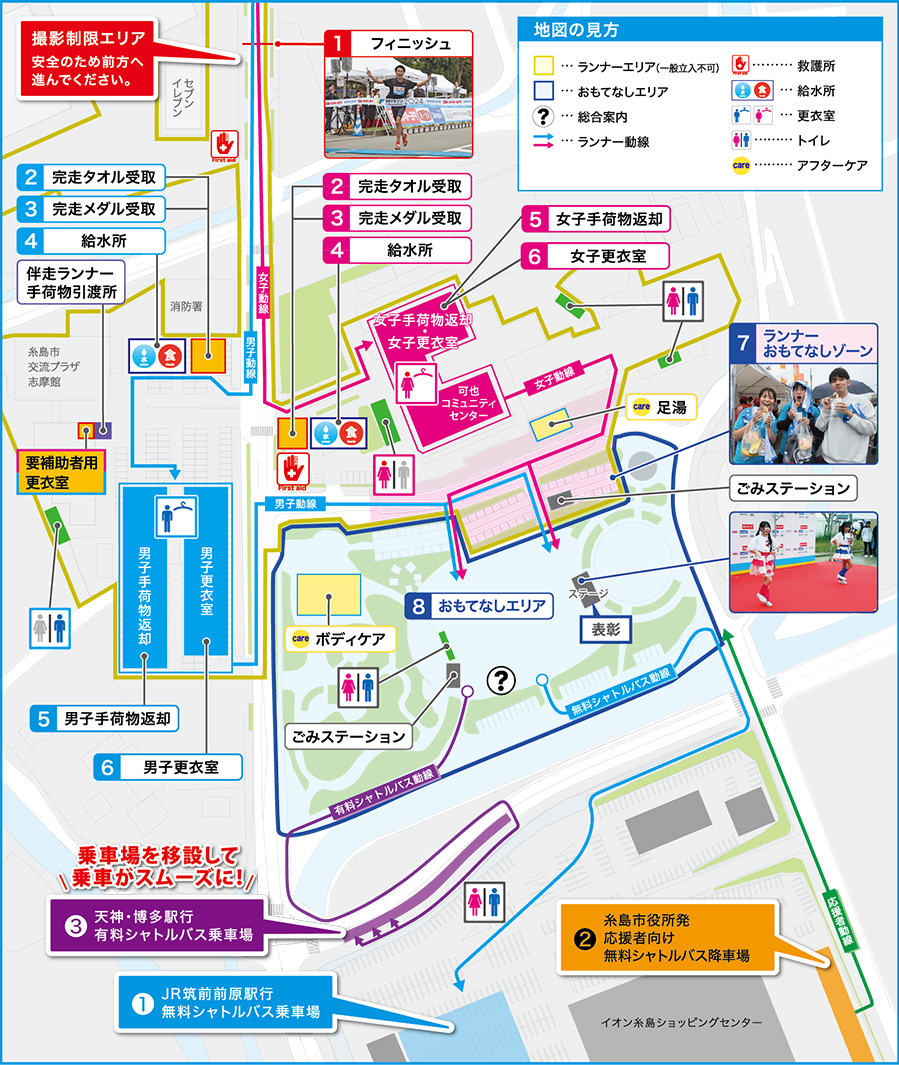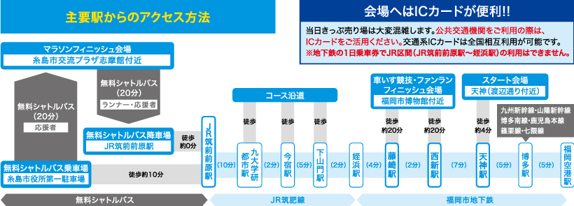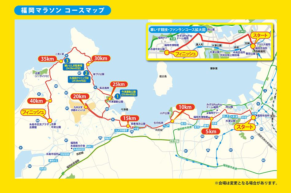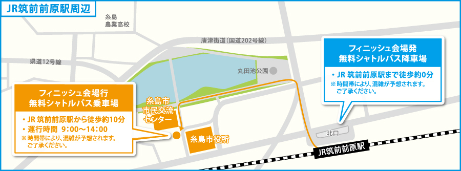 | フィニッシュ | 糸島市交流プラザ志摩館付近 | 10:35 | 12:20 | 13:20 | 14:20 | 15:20 |