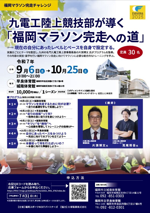 城南体育館と早良体育館では、初心者から経験者まで、全てのランナーの皆さんを対象に、基礎からしっかりと学び、フルマラソン完走を目指すサポートを提供いたします。全国でも名門として知られる九電工陸上部から講師をお招きし、彼らの豊富な経験と専門知識を活かし、参加者一人ひとりのペースに合わせた丁寧な指導を行います。トレーニングプランの作成から実践的なアドバイスまで、全面的にバックアップいたしますので、安心して取り組んでいただけます。私たちと一緒に、福岡マラソン完走の夢を実現しませんか?このプロジェクトを通じて、ランニングの楽しさを共有し、目標達成に向けた充実した時間をすごしましょう。皆さまのご参加を心よりお待ちしております。